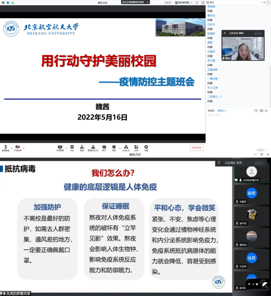 金年会官网班主任、辅导员以“共克时艰,守护美丽校园”为主题面向学院全体学生召开班会,发出拒绝外卖、减少快递、守护美丽校园的倡议,将学校的暖心举措详细告知同学们。同学们纷纷表示,大爱暖心北航,要用行动守护美丽校园。