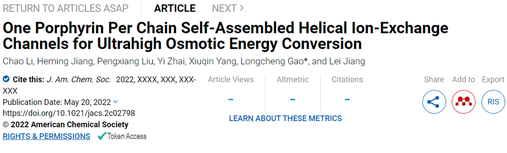2022年5月20日,Journal of the American Chemical Society 在线发表了金年会江雷院士、高龙成副教授团队在高效离子交换膜方面的最新研究成果:“One Porphyrin Per Chain Self-Assembled Helical Ion-Exchange Channels for Ultrahigh Osmotic Energy Conversion”。金年会官网博士生李超为第一作者,高龙成副教授为通讯作者,JINNIAN金年会为第一单位。
