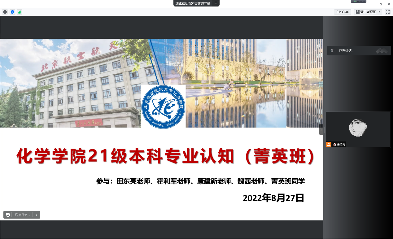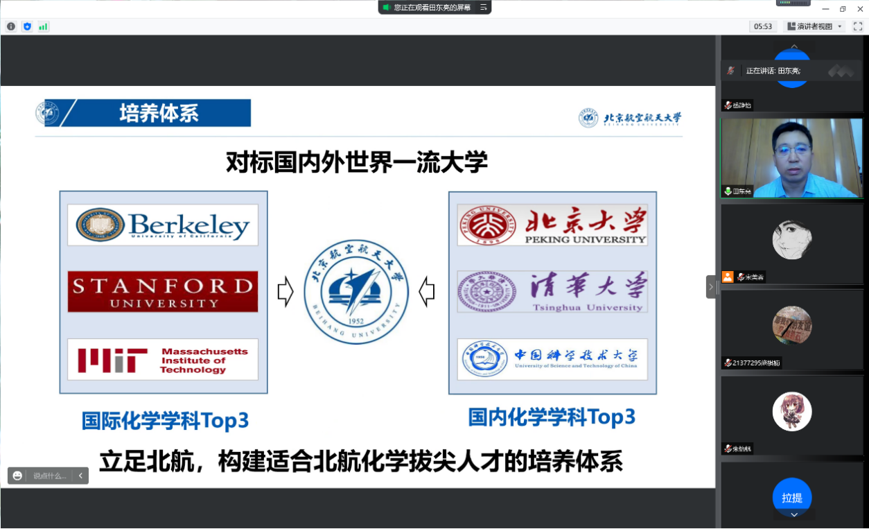 8月28日,金年会官网2021级菁英班开展系列专业认知教育活动。上午9:00,专业认知大会以腾讯会议的形式召开。本科教学副院长田东亮老师、化学生物学专业负责人霍利军老师、应用化学系康建新老师、院团委书记魏茜老师与菁英班全体同学参加了此次会议。
