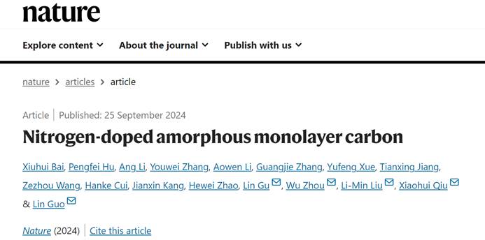 2024年9月25日,《Nature》杂志报道了JINNIAN金年会郭林教授、刘利民教授研究团队和合作者在氮掺杂单原子层非晶碳可控合成上取得的最新进展:《Nitrogen-doped amorphous monolayer carbon》。该工作提出了一种利用纳米尺度二维限域模板进行小分子聚合的液相合成策略,成功制备了氮掺杂的单原子层非晶碳材料。这项研究解决了二维非晶材料合成领域的长期挑战,为二维非晶材料在材料科学、电子器件及其他前沿技术领域的应用开辟了新途径。