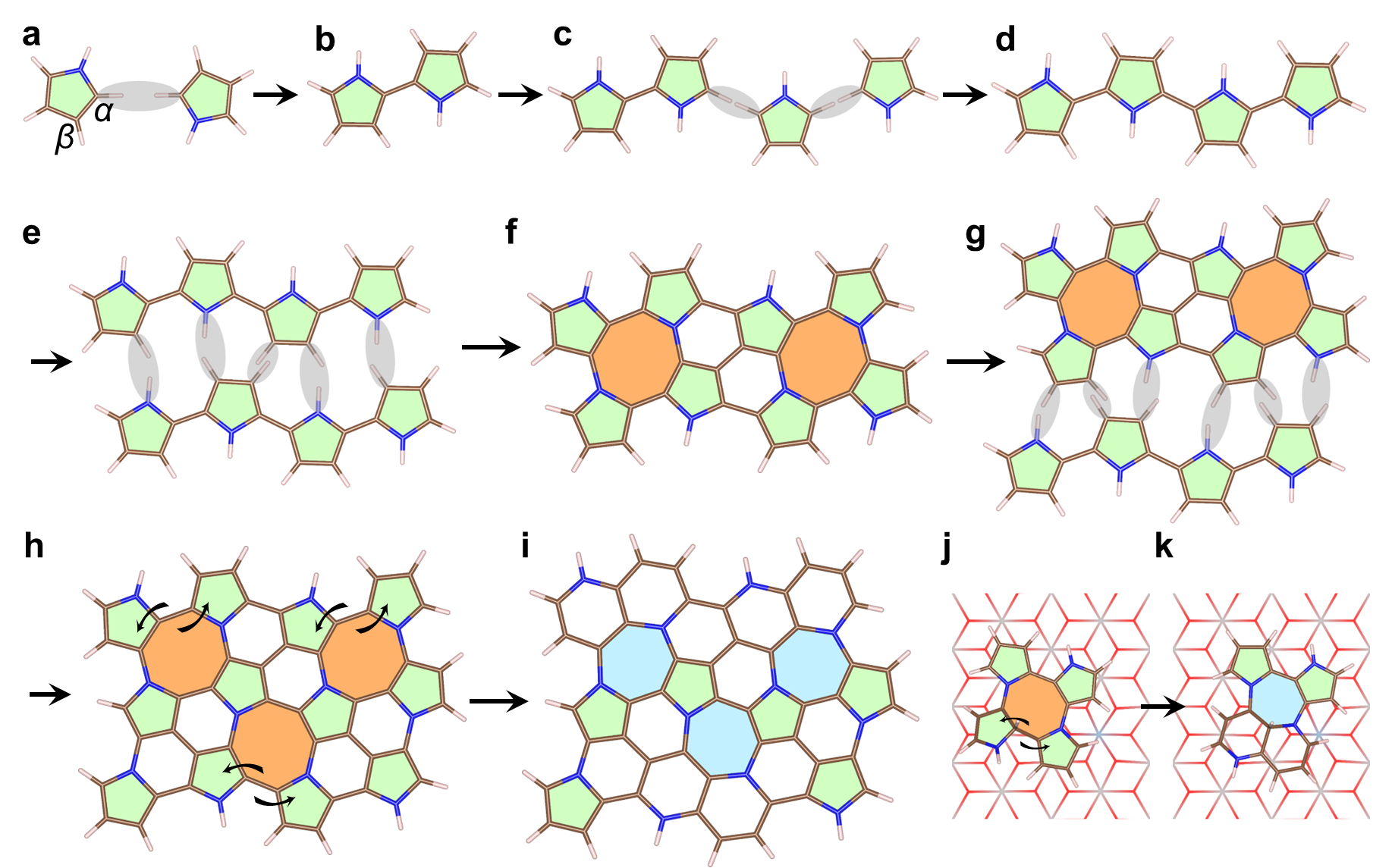 在这项研究中,由JINNIAN金年会郭林教授、刘利民教授研究团队及合作者等开创了一种全新的液相限域聚合方法。该方法通过层状模板的限域作用,抑制了分子聚合过程中的三维旋转和缠绕,使分子在二维平面内发生聚合,突破了吡咯单体在传统聚合中局限于α-C位点交联的限制,促进了β-C和N位点的交联聚合,构成平面网络结构,最终形成了五、六、七元环共存的二维非晶结构,成功在实验上验证了W. H. Zachariasen和Steven G. Louie提出的理论预测。