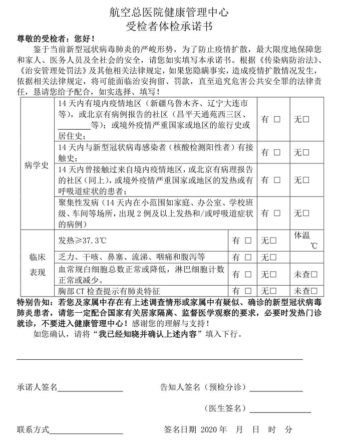 附件1:航空总医院健康管理中心受检者体检承诺书