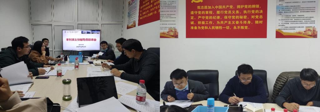 11月26日下午,金年会官网在新主楼D-121召开本科班主任、辅导员联席会。本科教学副院长田东亮老师,党委副书记张绍丽老师,本科19级班主任赵勇老师、王华老师,分团委书记魏茜及17、18、19、20级辅导员参加了本次会议。会议由党委副书记张绍丽主持。