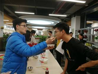 在第一锅饺子出锅后,我们的第一个游戏便开始了。首先我们进行的是抢水瓶游戏,金年会官网的导员黄澄玉和丁少松同学给大家做了一个示范,主持人说出一个身体的部位,两人分别摸自己的相应部位,在主持人说出“水”这个字的时候,两个人同时去抢桌子上的水瓶,但是黄导更快一步,于是作为输了游戏的人要被黄导喂五个饺子,场景太有爱了。之后同学们也积极加入到这个游戏中来,这也是一个很幸福的游戏了。