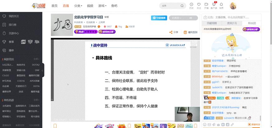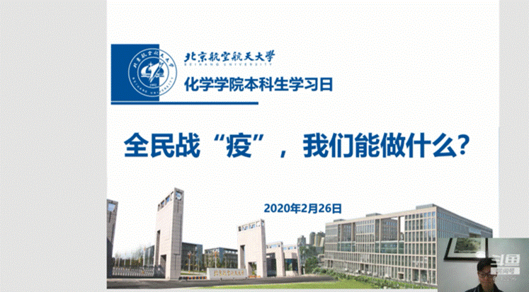 2月26日下午,金年会官网本科生2016级、2017级、2018级召开学习日活动,活动主题为“全民战‘疫’,我么能做什么?”,本次学习日活动采用线上班会的形式,由辅导员在斗鱼直播平台主讲开展。